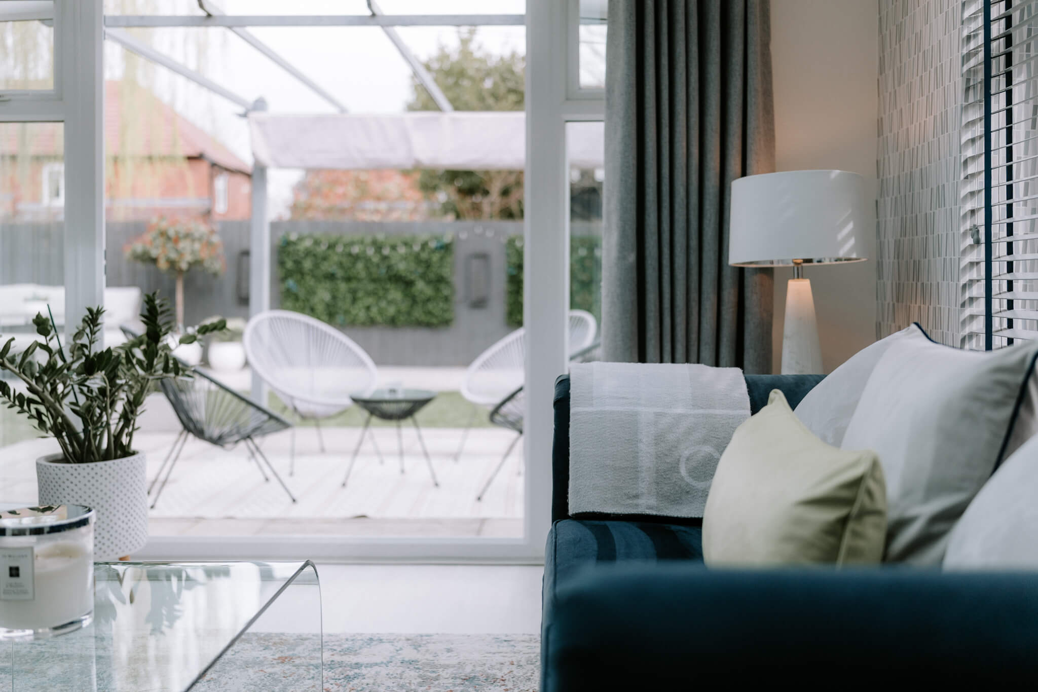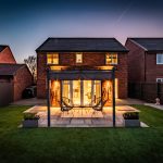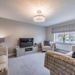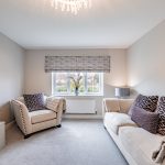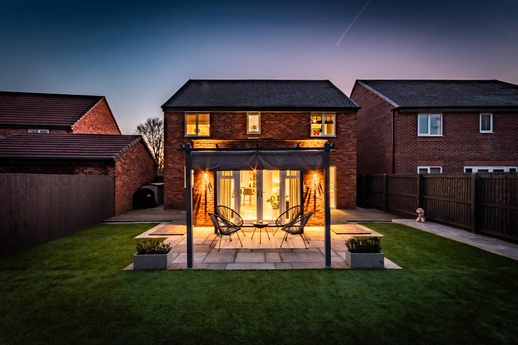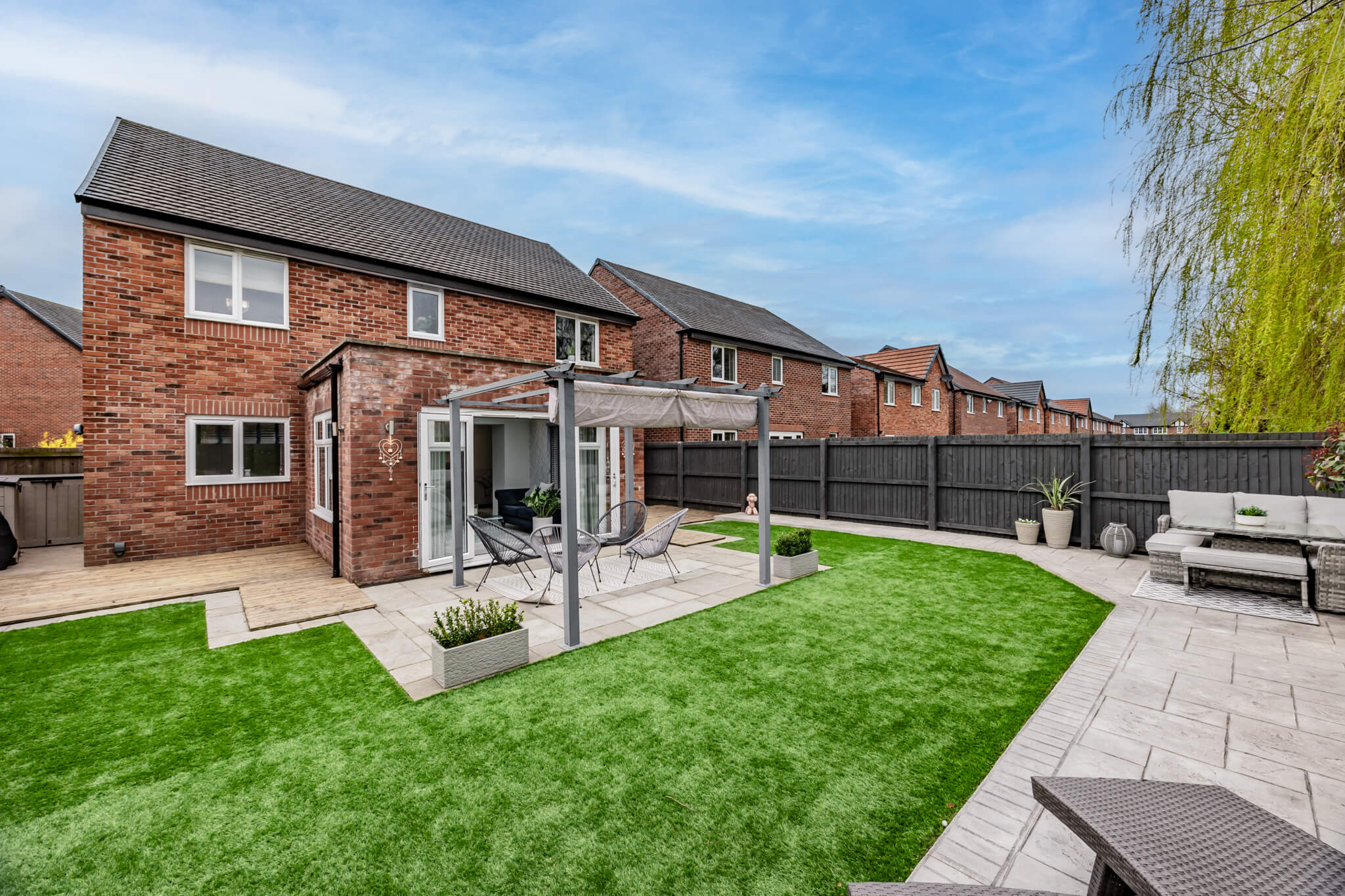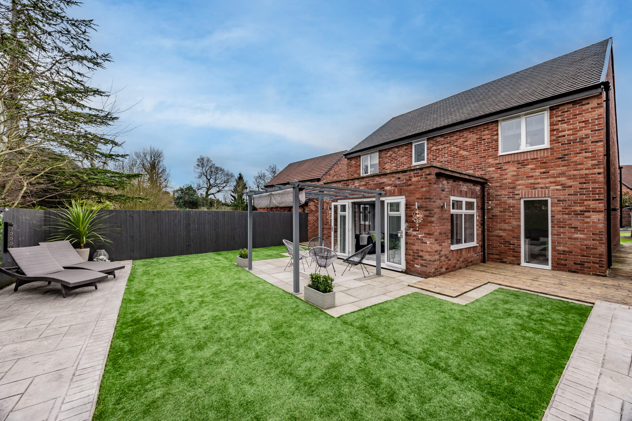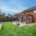 To the rear of the house a gorgeous, landscaped garden reflects the sense of style that flows throughout the house conjuring an enviable place to escape from the world outside. The French doors of the sitting room make it temptingly easy to step out beneath the shelter of a stylish pergola’s retractable canopy and enjoy al fresco dining in style on a stone paved patio. Extensive decking extends out to each side and the paving reaches around a central artificial lawn to a blissful second patio stretching out across the width of the garden giving you further excuse to recline in the summer sun. Perfectly positioned to admire idyllic views of the sun dipping down over the neighbouring fields, an established lawn at the front of the house reaches up to the canopied doorway encompassed by beds of roses and shrubs. To its side a broad brick paved driveway supplies private off-road parking for several vehicles, giving access to the integral garage which has been cleverly converted into handy storage space at the front and a considerably sized second space that could easily become a gym.