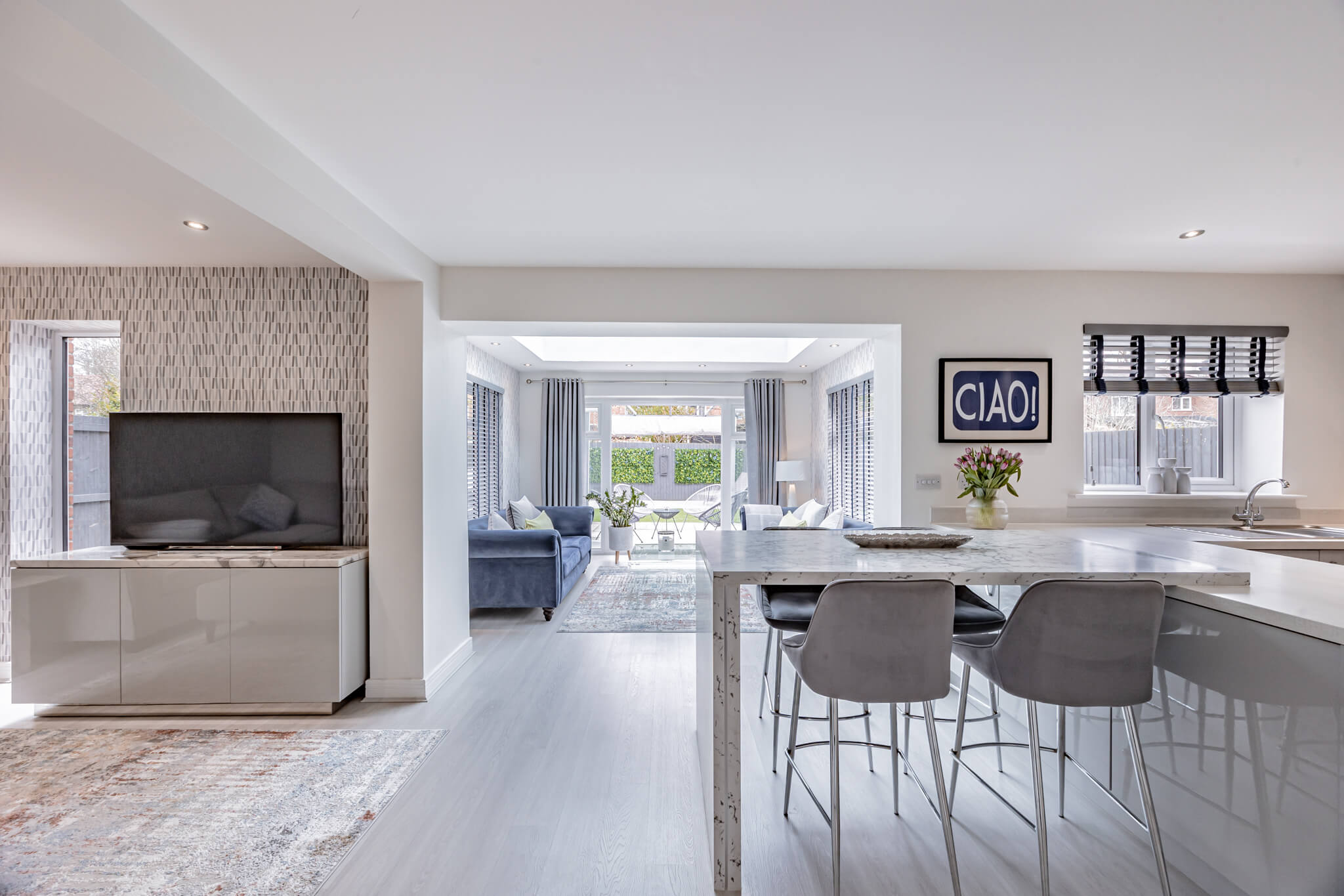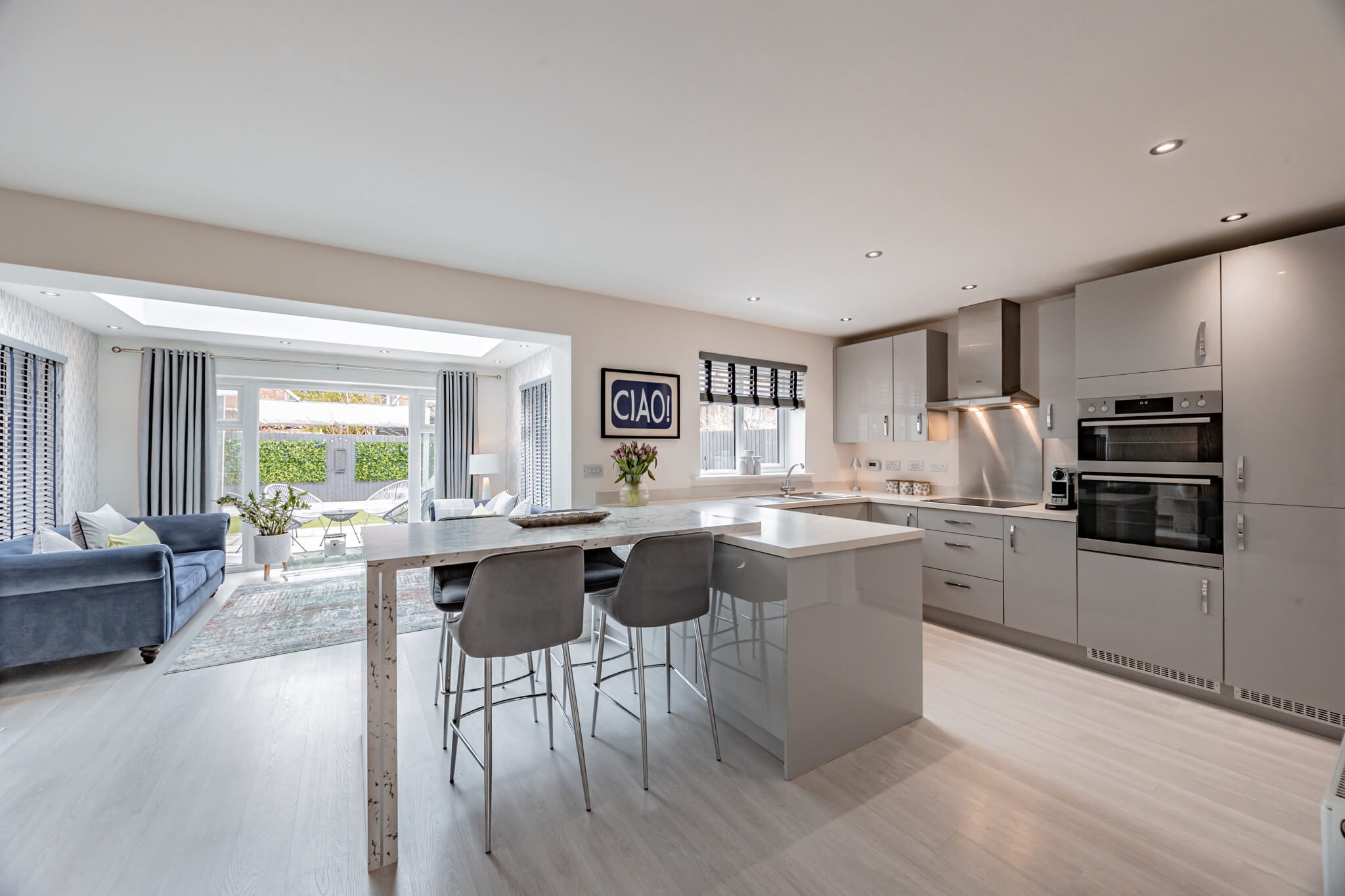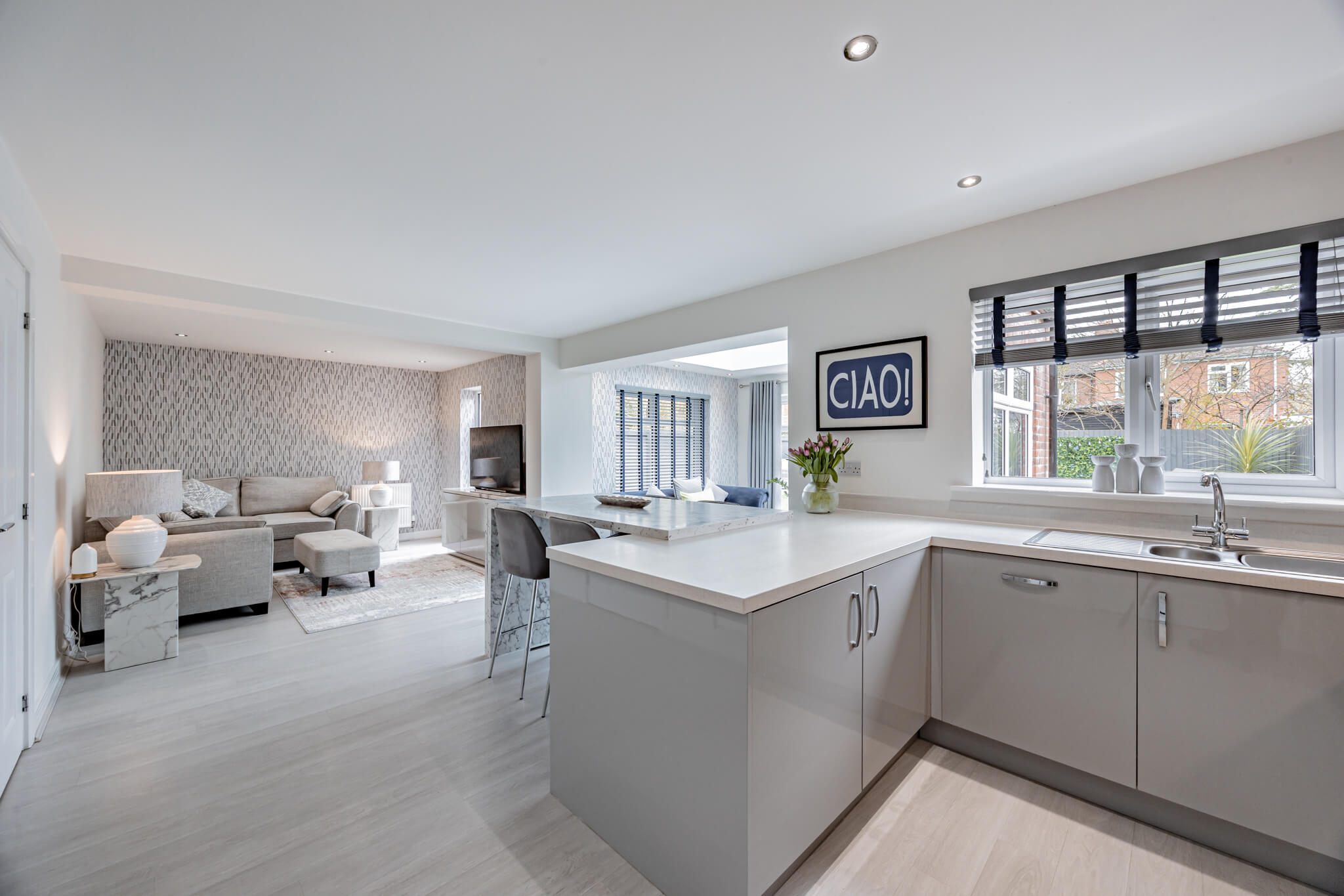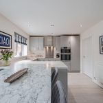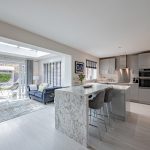 Lending calm and cohesion to each and every room, when you step inside you’ll find a beautiful palette of soft warm tones paired with subtle feature patterning and an abundance of natural light. Unfolding from a central hallway that instantly engenders an easy flow, a series of exemplary spaces create a wealth of versatility for day-to-day life. To the right-hand side, the generous lounge gives you every chance to relax and unwind, whilst spanning across the rear a magnificent open plan layout stretches out proffering a breathtaking example of contemporary design. The family room area with its tall picture window gives an inviting place to sit and catch up on the day’s events together, a central dining space extends seamlessly into an outstanding sitting room topped with a glorious roof lantern, and the sleek minimalist kitchen enhances an accomplished modern clean aesthetic. French doors in the triple aspect sitting room allow the patio and pergola outside to become an extension of the house, while the outstanding kitchen is supremely well-appointed with integrated AEG tower ovens and appliances, crisp white countertops and extended marble veined bar stool seating. Together these four defined yet fluid spaces unite to generate a superbly sociable space in which to create memories that will last a lifetime. A separate utility room sits tucked discreetly out of sight, and a ground floor cloakroom is ideal for guests.