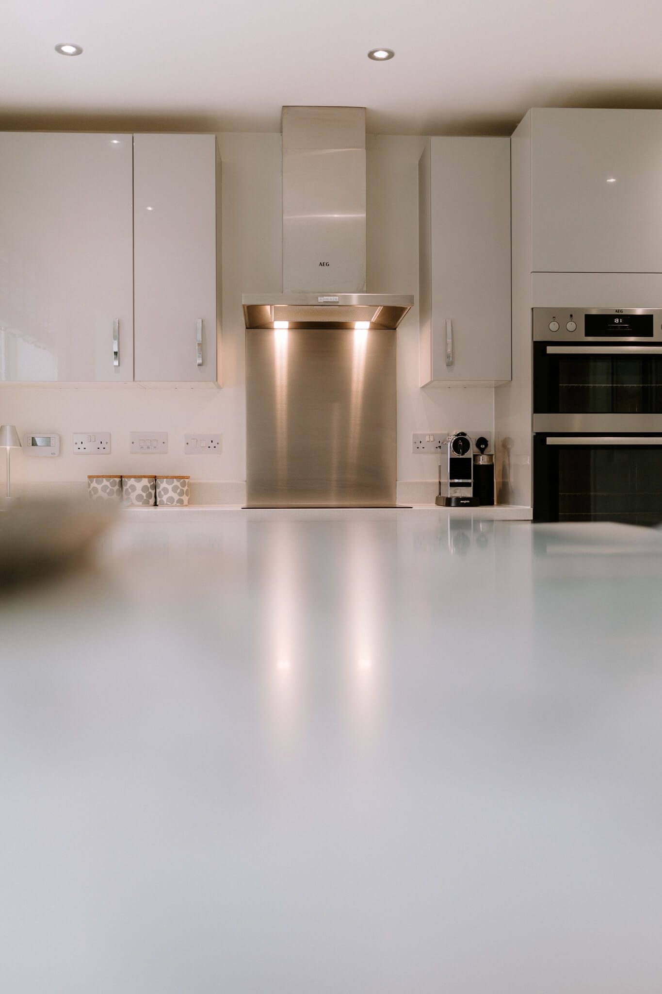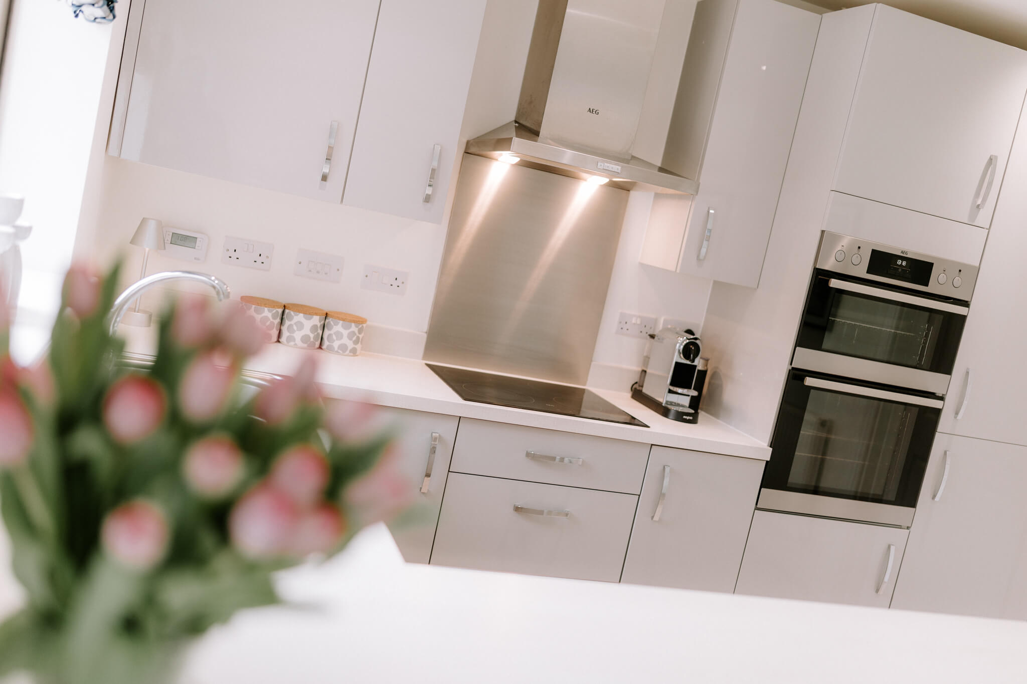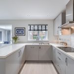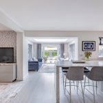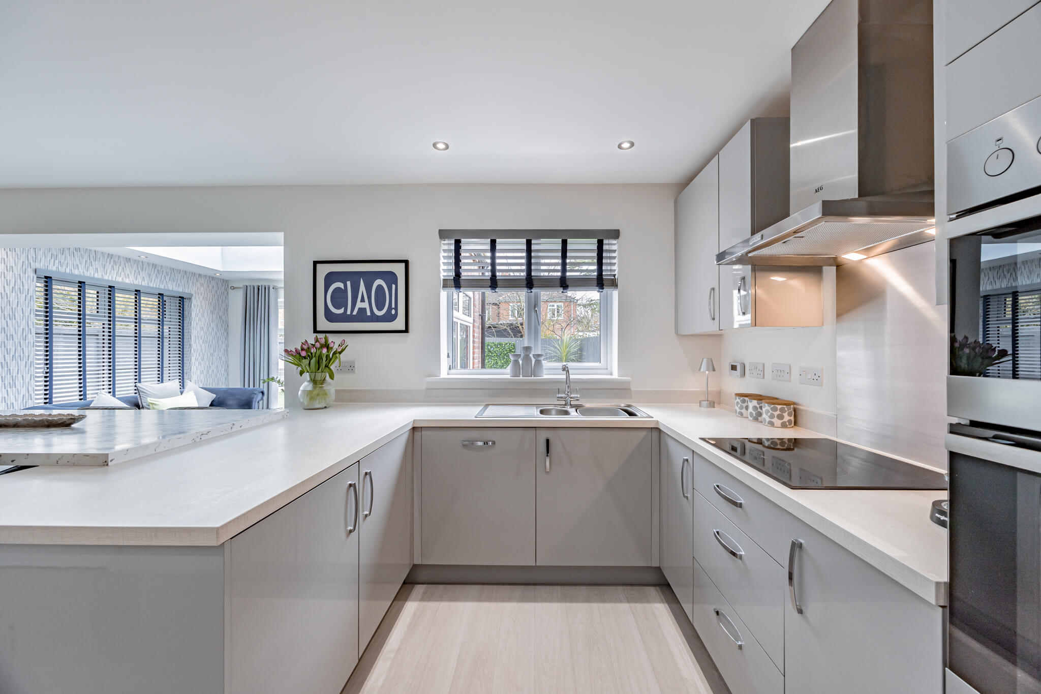 Lending calm and cohesion to each and every room, when you step inside you’ll find a beautiful palette of soft warm tones paired with subtle feature patterning and an abundance of natural light. Unfolding from a central hallway that instantly engenders an easy flow, a series of exemplary spaces create a wealth of versatility for day-to-day life. To the right-hand side, the generous lounge gives you every chance to relax and unwind, whilst spanning across the rear a magnificent open plan layout stretches out proffering a breathtaking example of contemporary design. The family room area with its tall picture window gives an inviting place to sit and catch up on the day’s events together, a central dining space extends seamlessly into an outstanding sitting room topped with a glorious roof lantern, and the sleek minimalist kitchen enhances an accomplished modern clean aesthetic. French doors in the triple aspect sitting room allow the patio and pergola outside to become an extension of the house, while the outstanding kitchen is supremely well-appointed with integrated AEG tower ovens and appliances, crisp white countertops and extended marble veined bar stool seating. Together these four defined yet fluid spaces unite to generate a superbly sociable space in which to create memories that will last a lifetime. A separate utility room sits tucked discreetly out of sight, and a ground floor cloakroom is ideal for guests.