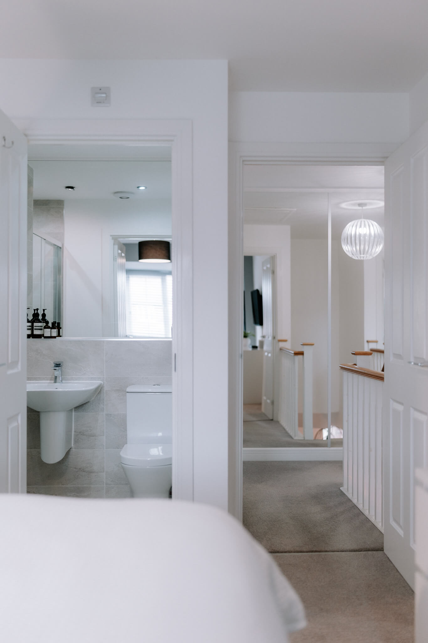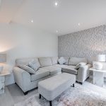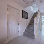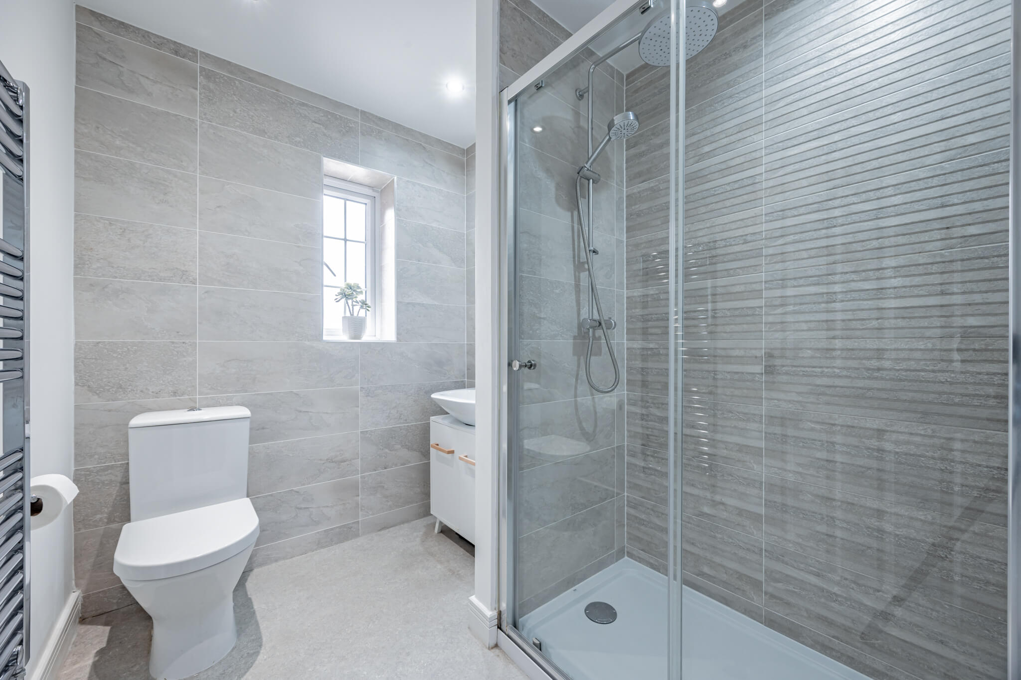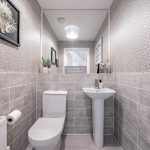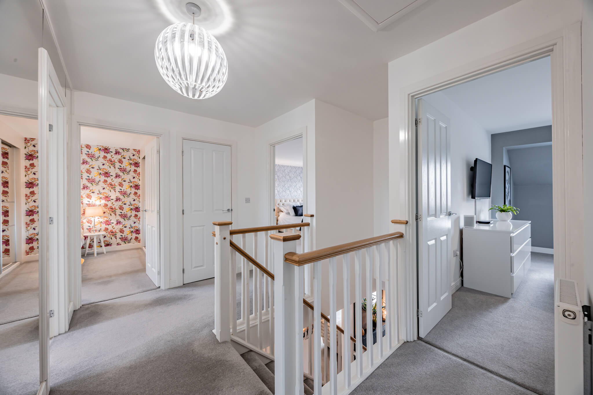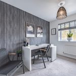 Upstairs a galleried landing instantly engenders a prized feeling of height and space, echoing the immaculate levels of presentation that you’ve come to expect. Around you are a series of four exemplary bedrooms which provide an ideal measure of flexible accommodation. Elegant and sophisticated, a spacious main bedroom has a hugely restful air. Its tastefully chosen fitted wardrobes supply an abundance of storage and bounce sunlight around the room while a deluxe en suite has a sublime double headed walk-in waterfall shower with the symmetry and texture of a grooved stone tile setting. The second double bedroom has a matching en suite of its own and decadently dark heritage hues. Across the landing two further bedrooms sit peacefully to the rear looking out over the garden and benefiting from ample fitted storage. Contemporary floral patterns inject a pop of colour to the third double bedroom, and the rich smoky grey Scandi tones of a faux wood slat wall provides a considered finishing touch to the final bedroom currently used as a study/office. Complementing the en suites, a refined family bathroom with a wall-mounted basin and a bath that has an overhead shower completes the layout of this exceptional modern-day home.