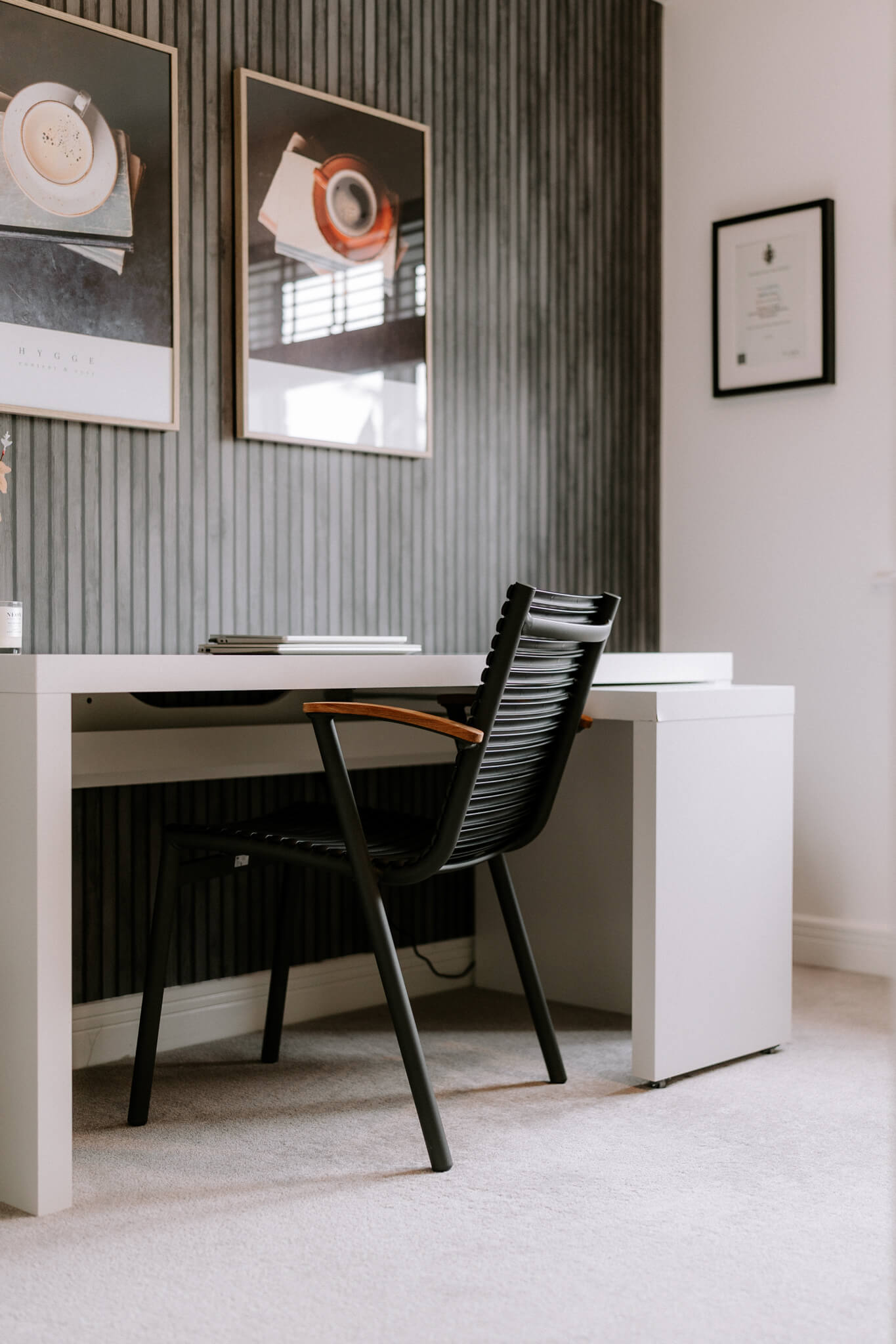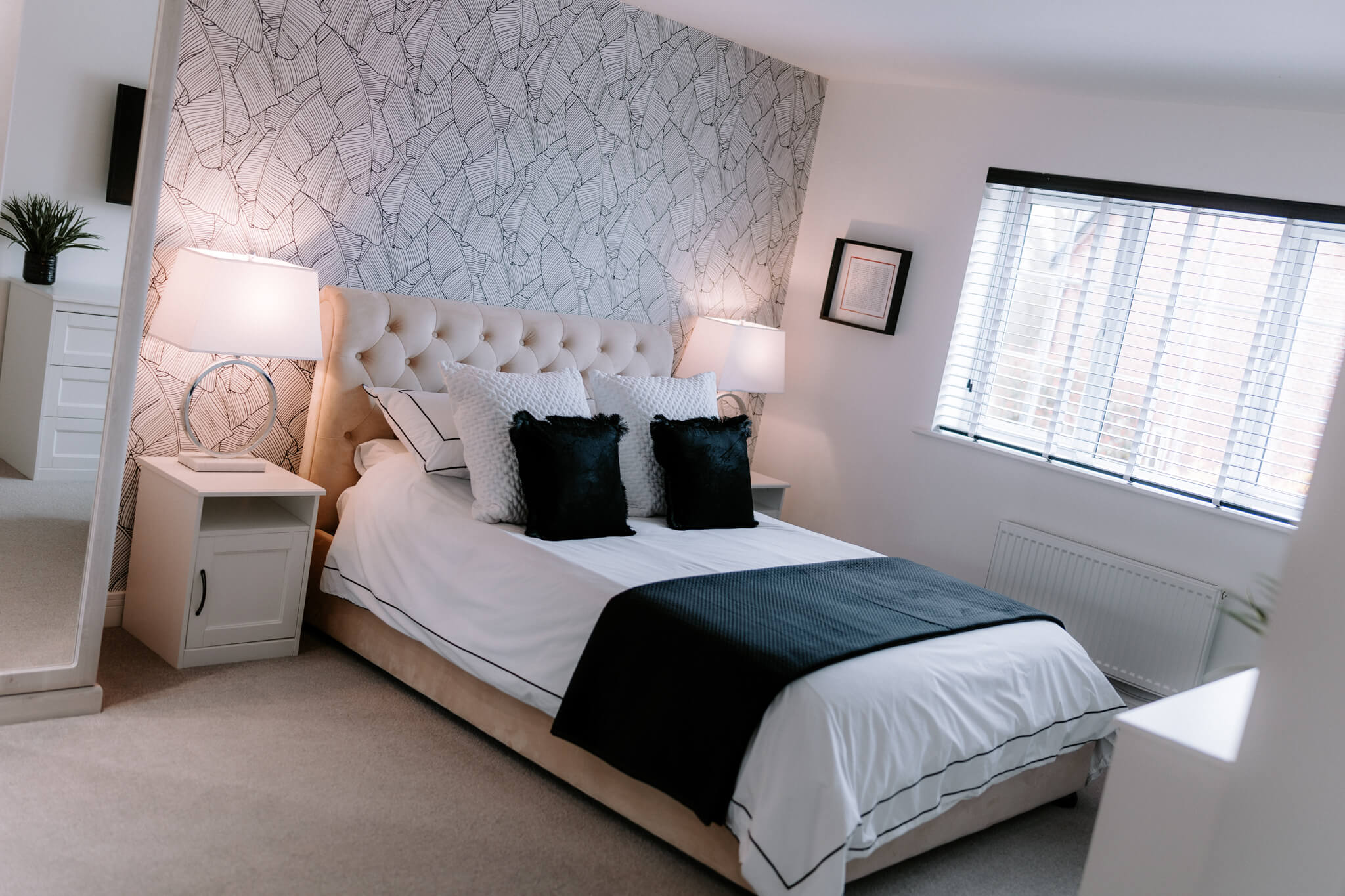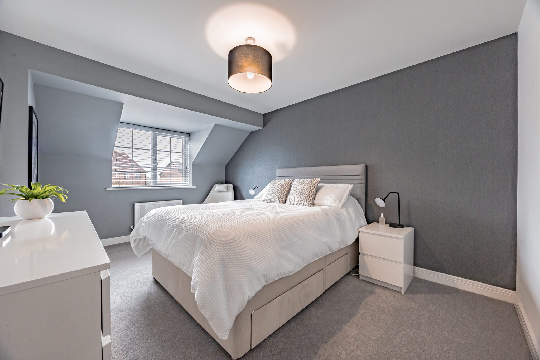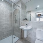 Upstairs a galleried landing instantly engenders a prized feeling of height and space, echoing the immaculate levels of presentation that you’ve come to expect. Around you are a series of four exemplary bedrooms which provide an ideal measure of flexible accommodation. Elegant and sophisticated, a spacious main bedroom has a hugely restful air. Its tastefully chosen fitted wardrobes supply an abundance of storage and bounce sunlight around the room while a deluxe en suite has a sublime double headed walk-in waterfall shower with the symmetry and texture of a grooved stone tile setting. The second double bedroom has a matching en suite of its own and decadently dark heritage hues. Across the landing two further bedrooms sit peacefully to the rear looking out over the garden and benefiting from ample fitted storage. Contemporary floral patterns inject a pop of colour to the third double bedroom, and the rich smoky grey Scandi tones of a faux wood slat wall provides a considered finishing touch to the final bedroom currently used as a study/office. Complementing the en suites, a refined family bathroom with a wall-mounted basin and a bath that has an overhead shower completes the layout of this exceptional modern-day home.