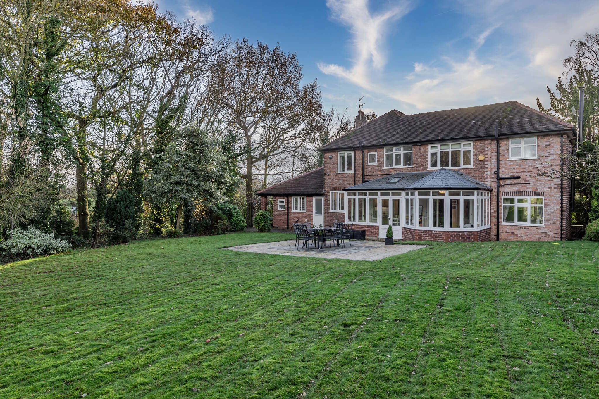 The generous lounge felt more inviting; the conservatory became a sanctuary of light; the kitchen read as the heart of family living; and the garden emerged as the defining feature — a rare slice of Cheshire countryside attached to a village home.